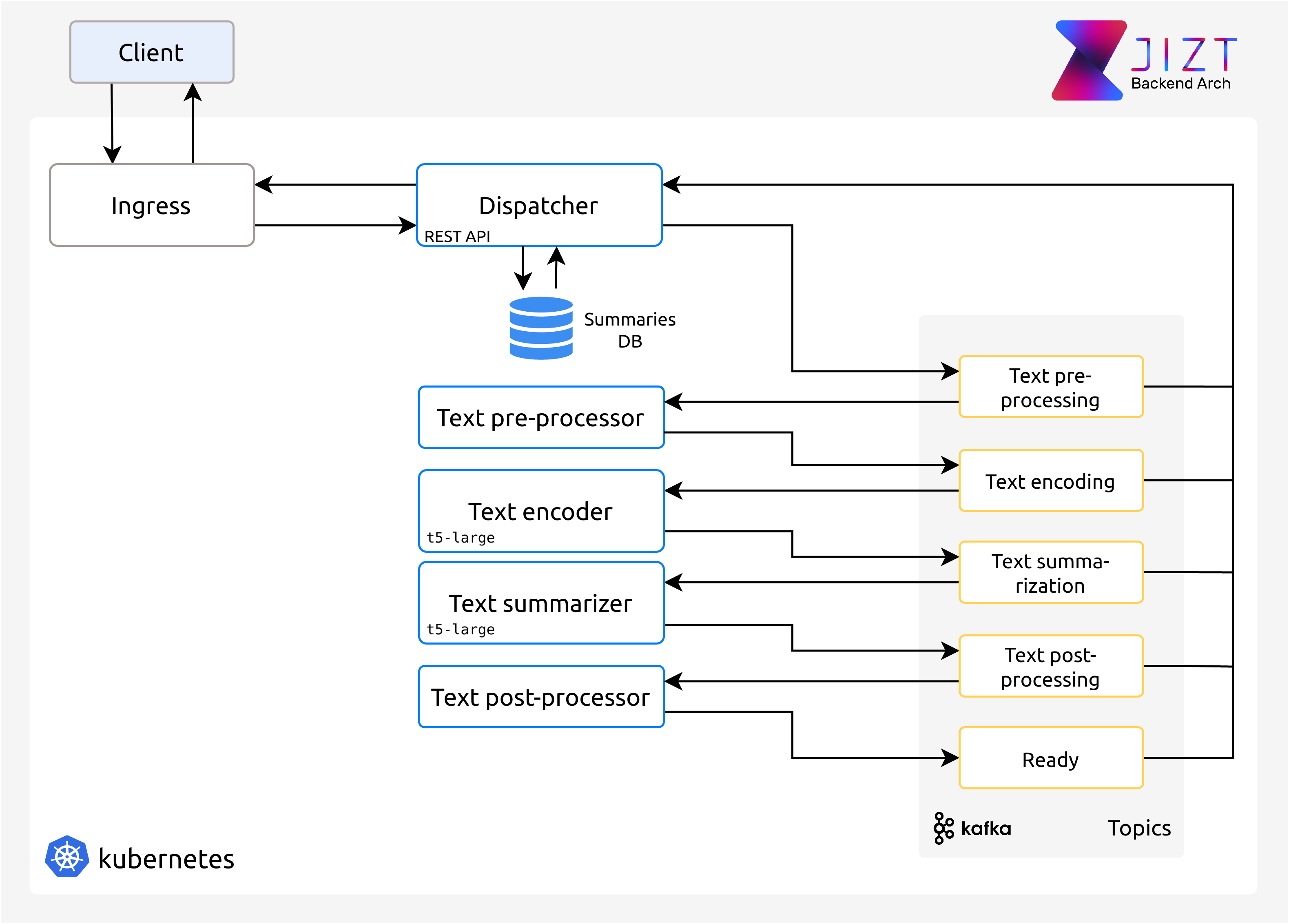 The architecture of Jizt’s backend has been conceived in a way that ensures flexibility, scalability and high availability. For that, we have implemented a microservice, event-driven architecture, so that each of the stages in the summarization process is contained in a microservice. This way, we can scale each microservice separately. This is useful, for example, in the case of the microservice that implements the summarization stage, since this is the most time-consuming stage. By scaling this microservice in particular, we are able to process more summaries in parallel.